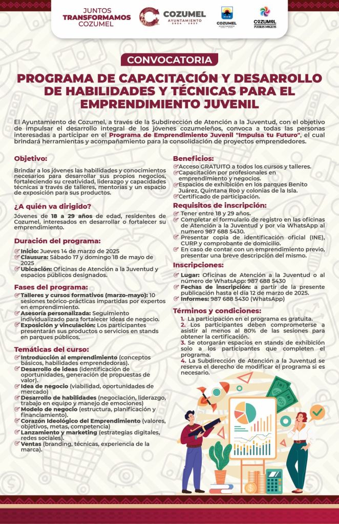 Los interesados podrán inscribirse en las oficinas de Atención a la Juventud, ubicadas en la 115 Avenida sur entre 5 y Morelos, a lado del parque San Gervasio, mejor conocí como “Las Rampas”, teniendo como fecha límite el 7 de marzo. También podrán pedir más información comunicándose al número telefónico 987 688 5430.