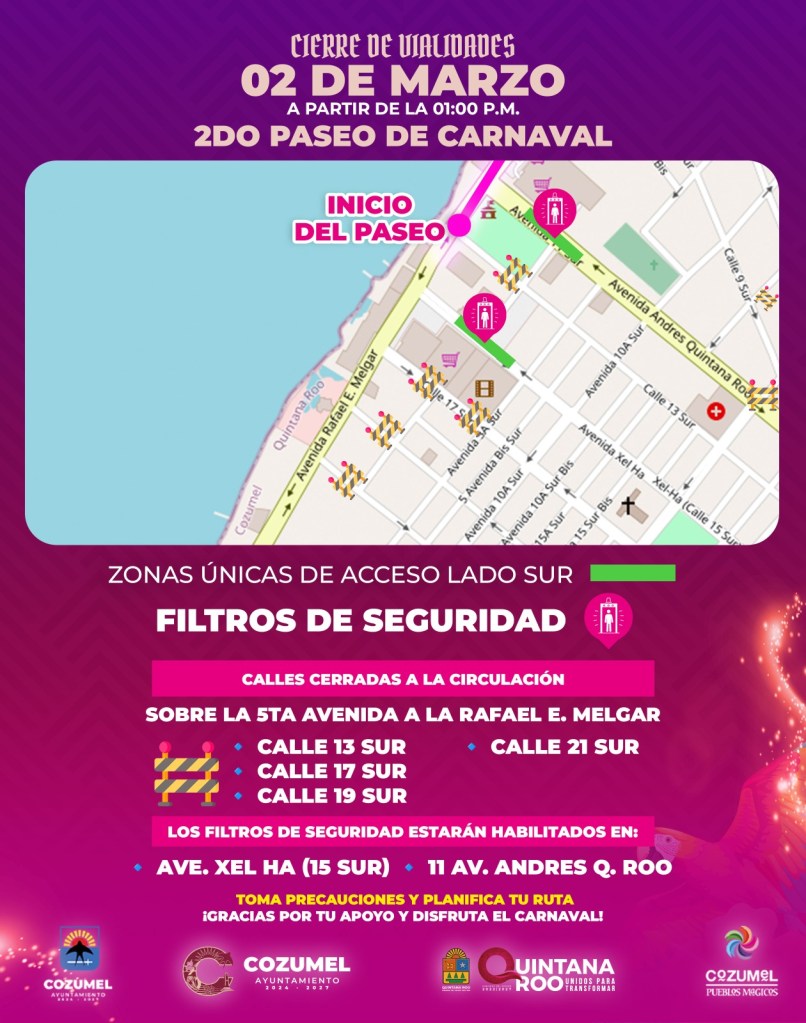 Cozumel, Q Roo, 27 Febrero 2025. Toma precauciones y planifica tu ruta porque habrá cierre de vialidades y se tendrán accesos establecidos con filtros de seguridad.
