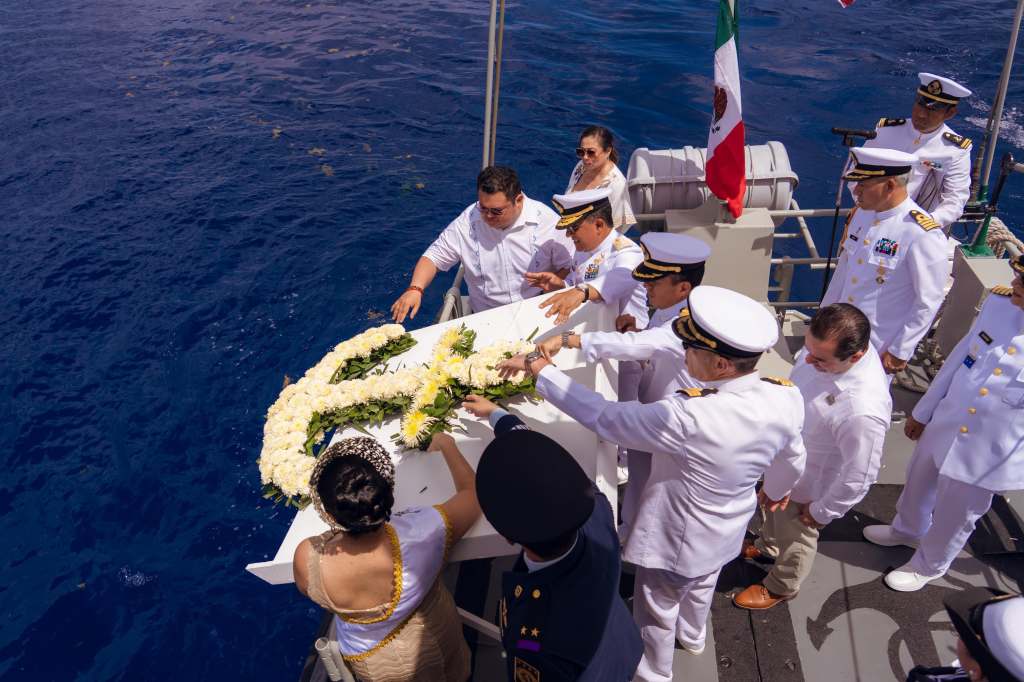 Cozumel, 01 de junio del 2025. – El presidente municipal, José Luis Chacón Méndez, encabezó este domingo la ceremonia conmemorativa por el LXXXIII Aniversario del Día de la Marina Nacional, acto en el que se rindió homenaje a los hombres y mujeres que han entregado su vida al servicio del mar, con una emotiva colocación de ofrenda floral en la rada de Cozumel.