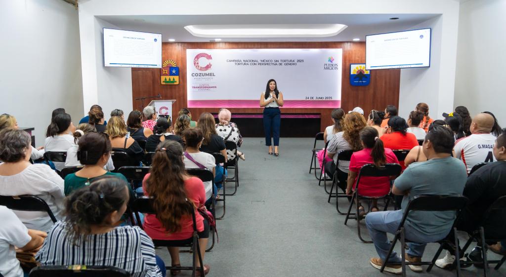 Cozumel, a 24 de junio de 2025.- Como parte de la campaña nacional “México sin tortura” Adda Ruth García Magaña Abogada con más de 17 años de experiencia en la defensa de los derechos humanos con justicia y equida impartió una ponencia a servidoras y servidores públicos.