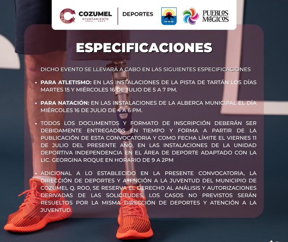 Cozumel, 01 de julio del 2025.- El gobierno municipal que encabeza José Luis Chacón Méndez, a través de la dirección de Deportes, abrió la convocatoria para el deporte adaptado en las disciplinas de natación y atletismo de campo y pista, con el propósito de integrar la delegación que representará a Cozumel en los Paranacionales CONADE, etapa estatal 2025.