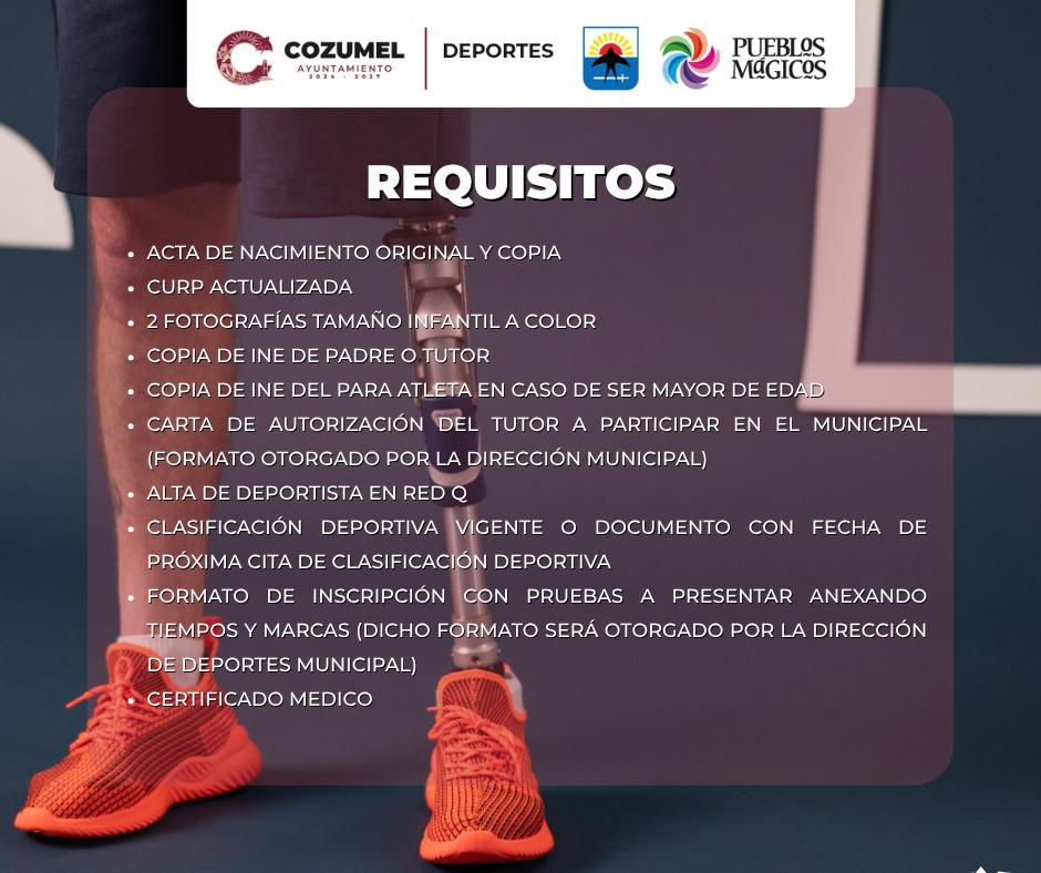 Las personas interesadas deberán presentar la siguiente documentación: acta de nacimiento original y copia, CURP actualizada, dos fotografías tamaño infantil a color, copia de INE del padre, madre o tutor, copia del INE del para atleta (en caso de ser mayor de edad), carta de autorización del tutor (formato otorgado por la dirección de Deportes), alta de deportista en RED Q, clasificación deportiva vigente o documento con fecha de próxima cita, formato de inscripción con pruebas a presentar anexando tiempos y marcas (formato proporcionado por la dirección de Deportes) y certificado médico.