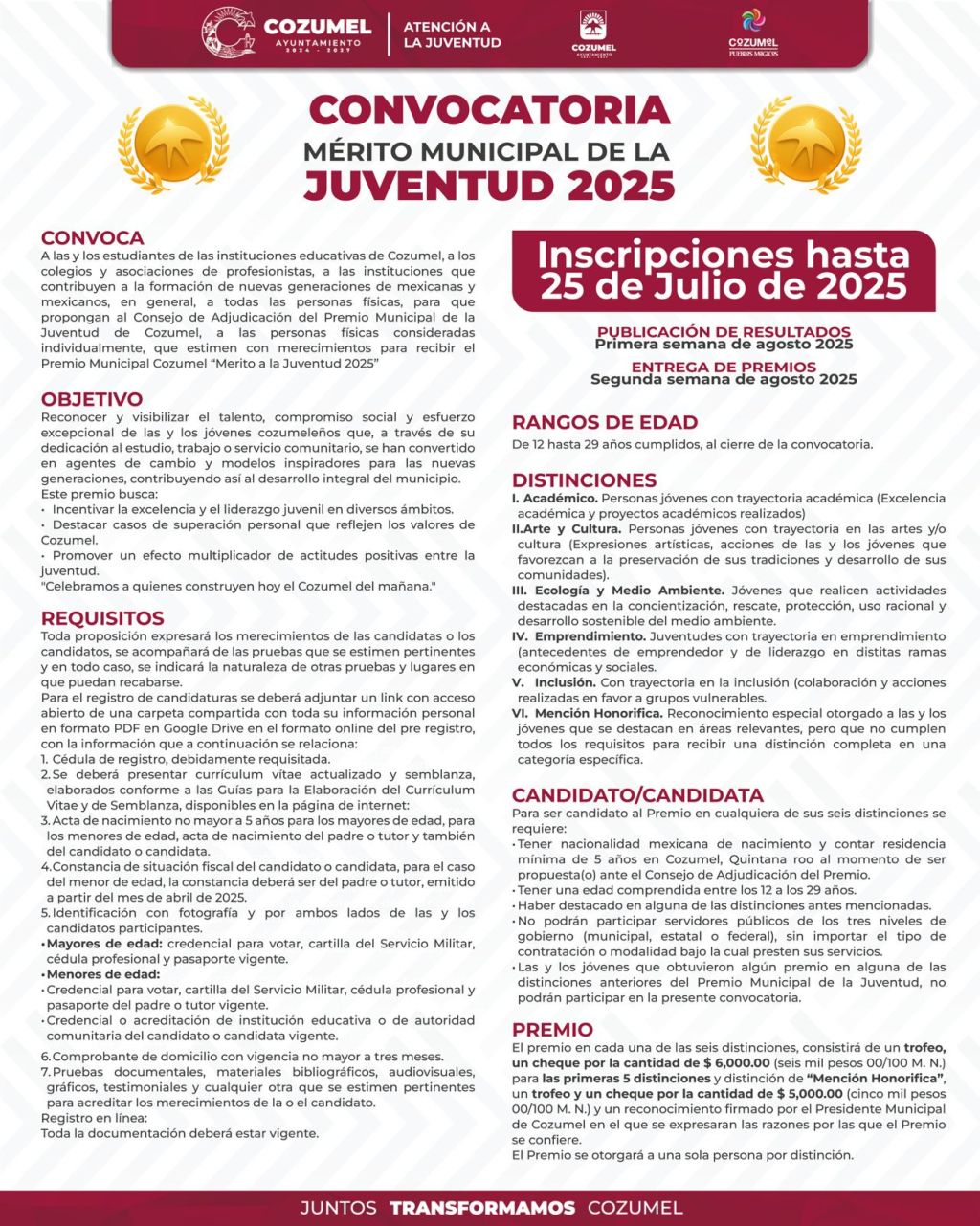 Cozumel, a 10 de julio de 2025.- Con el firme compromiso de reconocer el talento, esfuerzo y compromiso social de las juventudes cozumeleñas, el Ayuntamiento de Cozumel, que encabeza José Luis Chacón Méndez, a través de la subdirección de Atención a la Juventud, lanzó la convocatoria al Premio Municipal de la Juventud Cozumel 2025.
