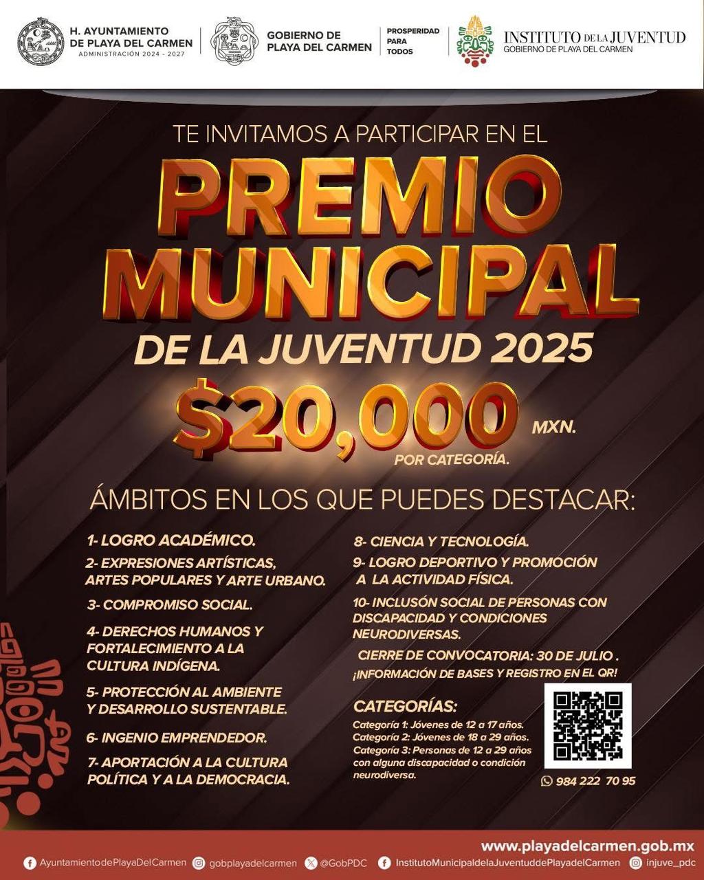 Playa del Carmen, Quintana Roo, 16 de julio de 2025.— El Instituto de la Juventud de Playa del Carmen lanzó la convocatoria para el Premio Municipal de la Juventud 2025, máximo reconocimiento que otorga el gobierno municipal a las y los jóvenes que se distinguen por su compromiso, talento y aportaciones en beneficio de la comunidad.