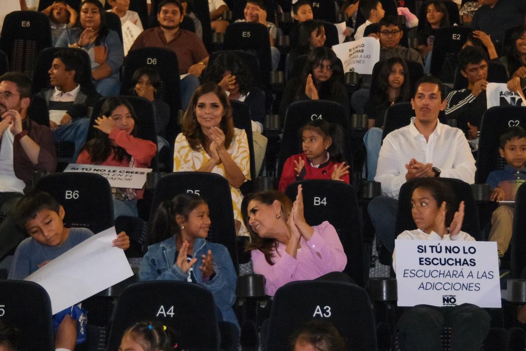 La titular del Ejecutivo estatal acompañada por la presidenta del Sistema DIF-Quintana Roo, Verónica Lezama Espinosa, de alumnas y alumnos de Pilares-DIF de Villas Otoch Paraíso, quienes asistieron al Cinépolis de la plaza comercial Las Américas gracias al apoyo de ADO, dijo que a partir de esta semana la campaña “L@s niñ@s no se rompen”, estará proyectando el vídeo en 127 salas de todo el estado.