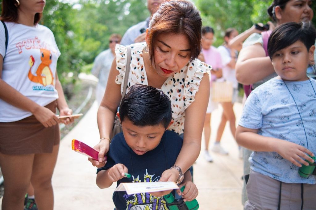Posteriormente, se ofreció una breve capacitación sobre el uso correcto de binoculares y guías de campo para identificar aves, con el acompañamiento del colectivo Pajareando Cozumel. Luego, se realizó una caminata de observación por el Parque Urbano Corazón, durante la cual las y los asistentes pudieron identificar 22 especies de aves, entre ellas el maullador negro, el víreo yucateco, la esmeralda de isla Cozumel, el carpintero yucateco, la reinita mielera, la paloma corona blanca y la perlita azulgris. A medida que se iban registrando las especies avistadas, se desarrolló una dinámica educativa tipo bingo, con tarjetas diseñadas especialmente para reconocer visualmente las aves del parque, lo que permitió una experiencia de aprendizaje divertida y participativa.