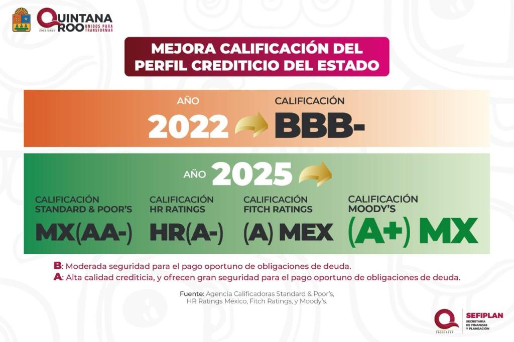 Esta mejora en la calificación crediticia refleja el compromiso del Gobierno del Estado con el manejo responsable, eficiente y transparente de las finanzas públicas, lo que fortalece la confianza de inversionistas y agencias calificadoras en la solidez económica de Quintana Roo.