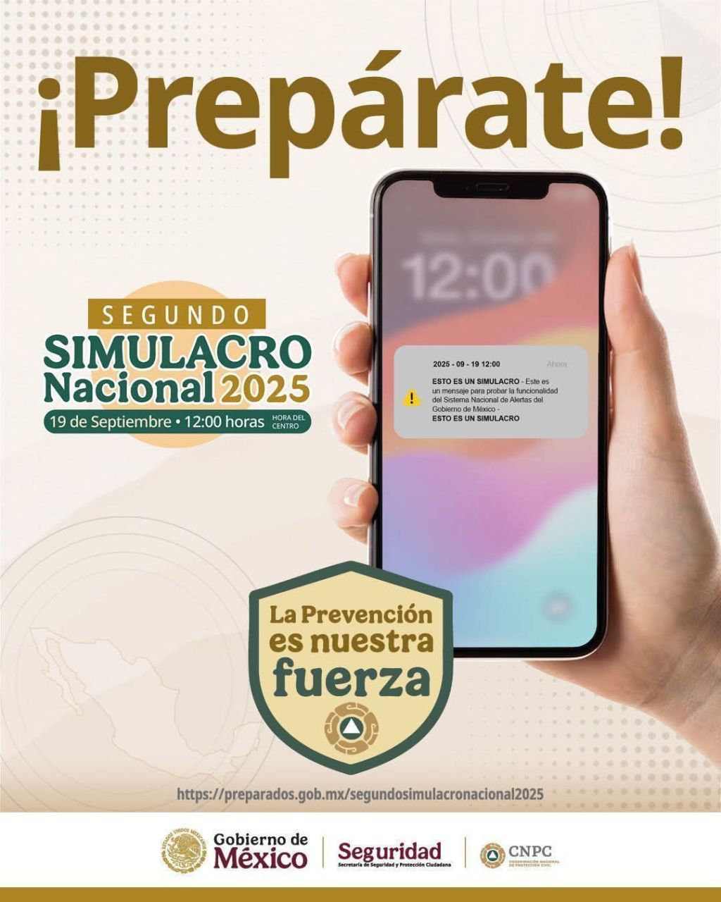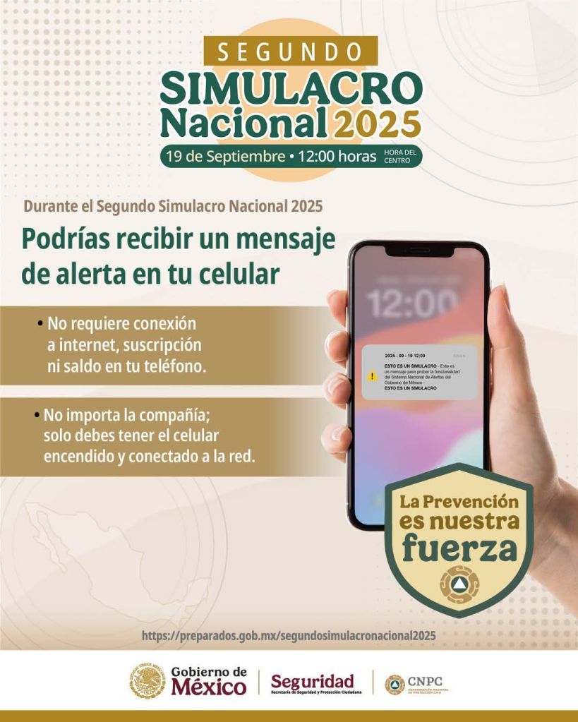 Por primera vez en la historia, el simulacro contará con la activación del Sistema Nacional de Alertas, que enviará un mensaje de prueba a todos los teléfonos celulares del país, como parte de las acciones de prevención y seguridad. Este aviso aparecerá en la pantalla de los dispositivos móviles, acompañado de una notificación sonora y visual que indicará claramente que se trata de un simulacro.