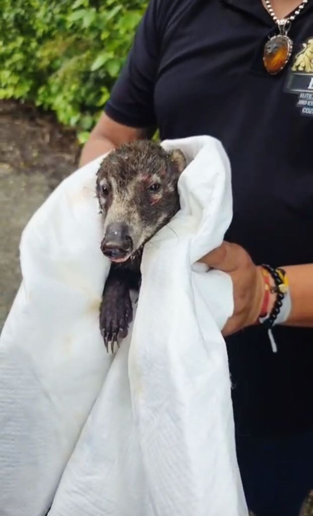 Cozumel, a 30 de septiembre de 2025.- En pasados días la administración que encabeza, José Luis Chacón Méndez, a través de la dirección de Ecología y al trabajo coordinado con la dirección de Protección Civil, se logró rescatar una especie endémica y en peligro de extinción el Mapache Pigmeo de Cozumel, que se encontraba atrapado en la malla de una palapa .