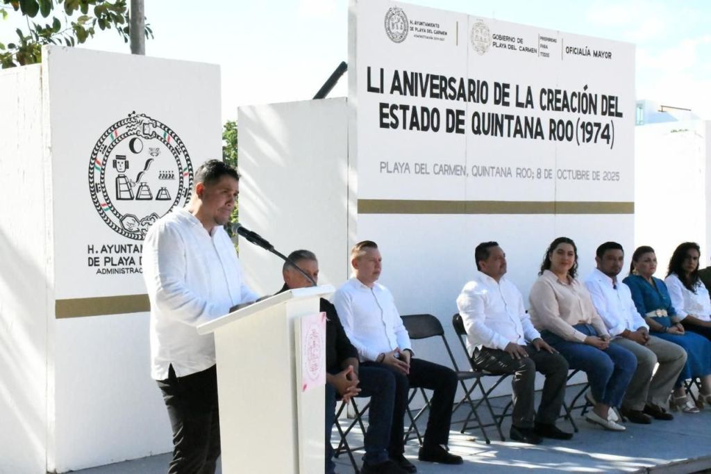 Playa del Carmen, Quintana Roo, 8 de octubre de 2025. – Con un acto cívico realizado en la Plaza 28 de Julio, el Ayuntamiento de Playa del Carmen conmemoró el 51 aniversario de la creación del Estado de Quintana Roo, resaltando la historia, fortaleza y desarrollo que han distinguido a la entidad a lo largo de más de cinco décadas.