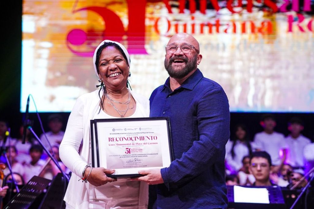 Uno de los momentos más emocionantes fue la interpretación de “Las Mañanitas” por el Coro Monumental, integrado por alrededor de 170 personas, entre alumnos de la Escuela de Iniciación Artística asociada al INBAL, de la Escuela de Música de Puerto Aventuras, talleres musicales y personal de diversas subdirecciones del Instituto. El público se levantó de sus asientos para acompañar cada estrofa.