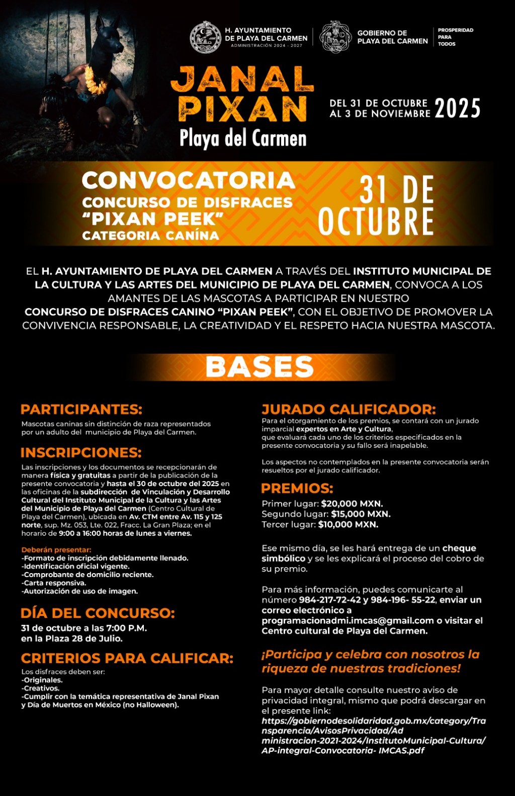 Por lo que toca al concurso de disfraces “Pixan Peek” categoría canina, se realizará el 31 de octubre en la Plaza 28 de Julio y tendrá un primer premio de 20 mil pesos.