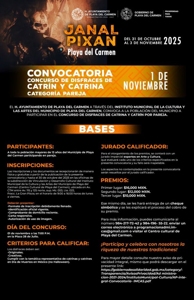 Playa del Carmen, Quintana Roo, 22 de octubre de 2025.- El Instituto Municipal de la Cultura y las Artes de Playa del Carmen invitó a las familias playenses a participar en los diversos concursos que se llevarán a cabo en el marco de las festividades del Janal Pixan 2025, con una bolsa en premios de casi 200 mil pesos.