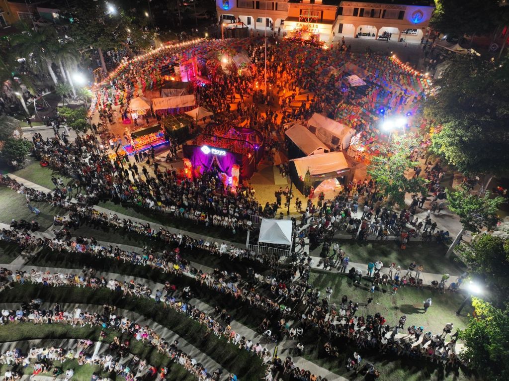 Playa del Carmen, Quintana Roo, 31 de octubre de 2025.- Con una multitudinaria asistencia de playenses y turistas dio inicio esta noche, en la Plaza 28 de Julio, el Janal Pixan 2025 “Pixano ob sáasilo ‘ob. Finados seres de luz”, que contó con una brillante exhibición de “Los Altares de México” y la presentación de artistas en el anfiteatro.