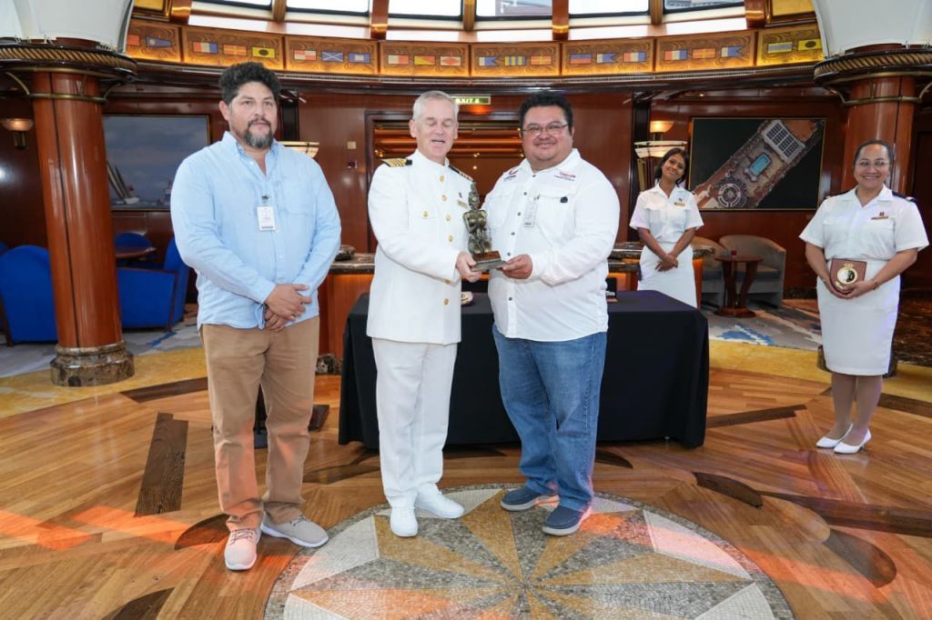 Durante la ceremonia de intercambio de placas con el capitán, Stephen Howarth, el alcalde destacó la relevancia de la llegada de esta embarcación de lujo, propiedad de la reconocida línea Cunard Line, cuya presencia en el puerto representa un impulso a la economía local y una muestra de la confianza de las navieras internacionales en la infraestructura y hospitalidad de Cozumel.