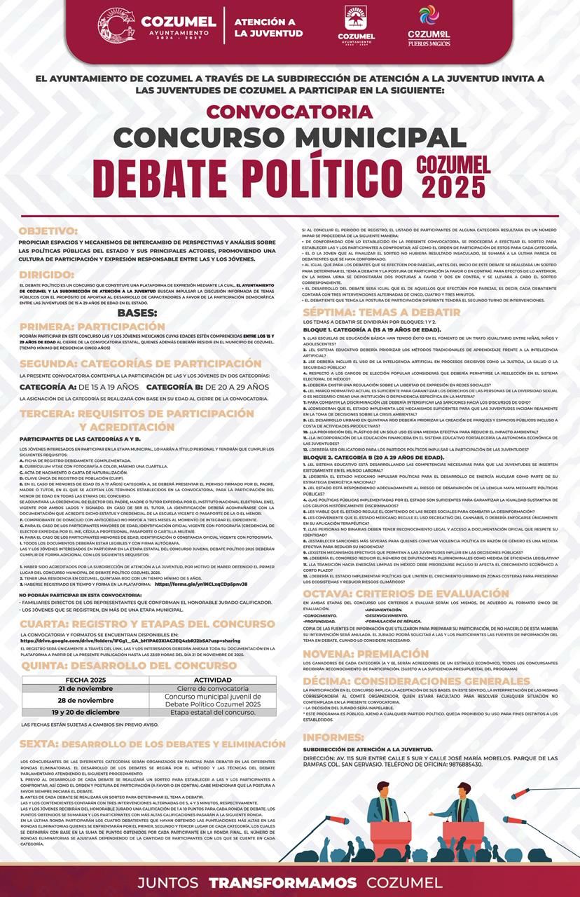 Cozumel, a 5 de noviembre de 2025.- Con el propósito de promover la participación juvenil y el intercambio de ideas sobre temas públicos y sociales, el Ayuntamiento de Cozumel que preside José Luis Chacón Méndez, a través de la subdirección de Atención a la Juventud, invita a las y los jóvenes a participar en el Concurso Municipal de Debate Político Cozumel 2025.