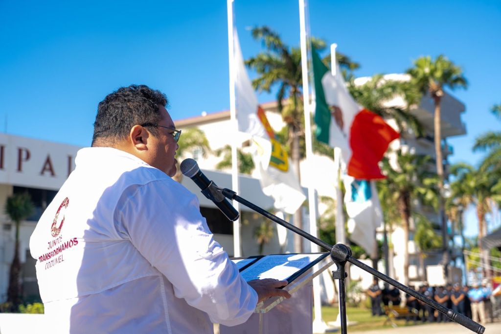 Durante su mensaje, el presidente, Chacón dirigió un saludo respetuoso a las autoridades militares, navales, civiles, de seguridad pública y asistentes, con un reconocimiento especial a Don Lenin Mendoza Castro, a quien calificó como “un gran testigo de la historia de nuestra isla”. Asimismo, agradeció la presencia del Jardín de Niños Cozumel, resaltando que su entusiasmo refleja el futuro orgulloso de la comunidad.