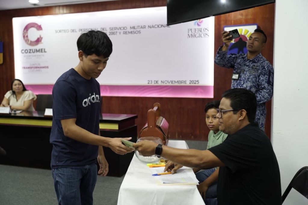 Cozumel, a 23 de noviembre de 2025.- La mañana de este sábado se llevó a cabo en el Salón Municipios del palacio municipal la ceremonia del Sorteo del Servicio Militar Nacional de la clase 2007 y remisos, a la cual asistieron 116 jóvenes.