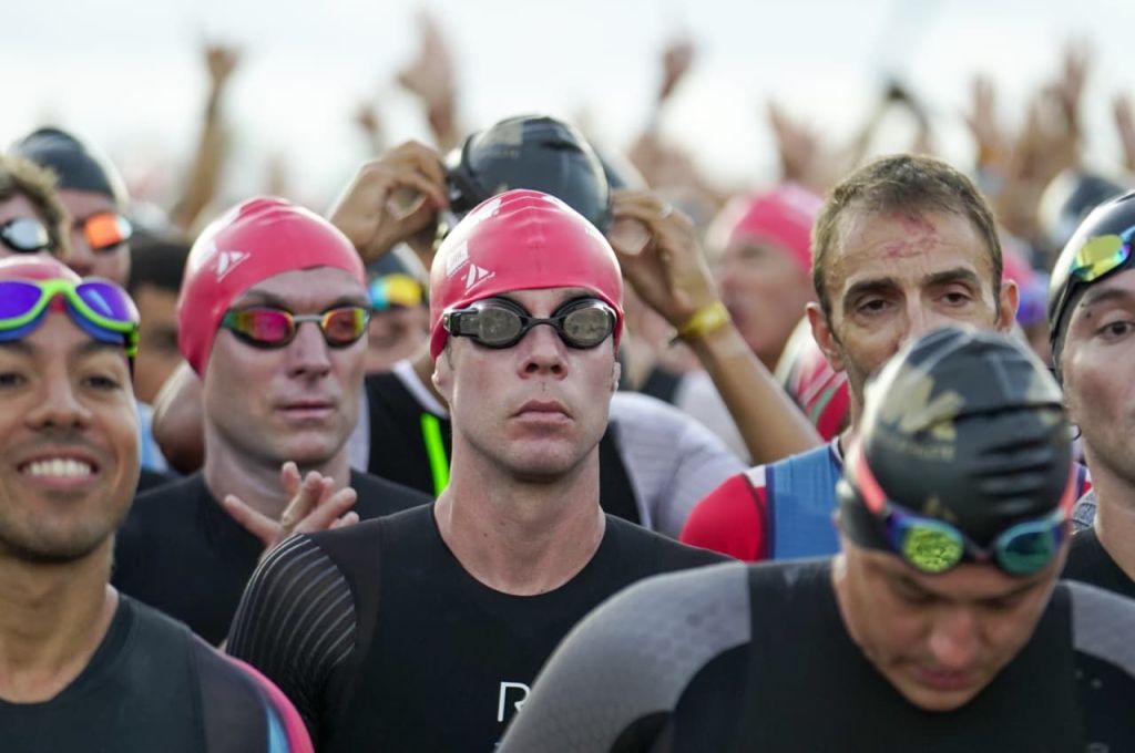En total, cerca de 100 triatletas profesionales se unieron a los competidores por edad para completar los 3.8 km de natación, 180 km de ciclismo y 42.2 km de carrera pedestre.