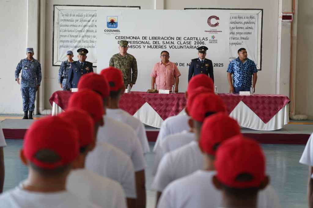 Cozumel, 29 de noviembre del 2025. – En solemne ceremonia realizada en el hangar de la Base Aérea Militar, se llevó a cabo la liberación de cartillas del Servicio Militar Nacional (SMN) clase 2006, remisos y mujeres voluntarias. En representación del Presidente Municipal, José Luis Chacón, acudieron como invitados especiales el regidor Javier Ovidio Vázquez López y el subdirector de Educación, Saturnino Magaña Valle, quienes atestiguaron el acto cívico-militar.