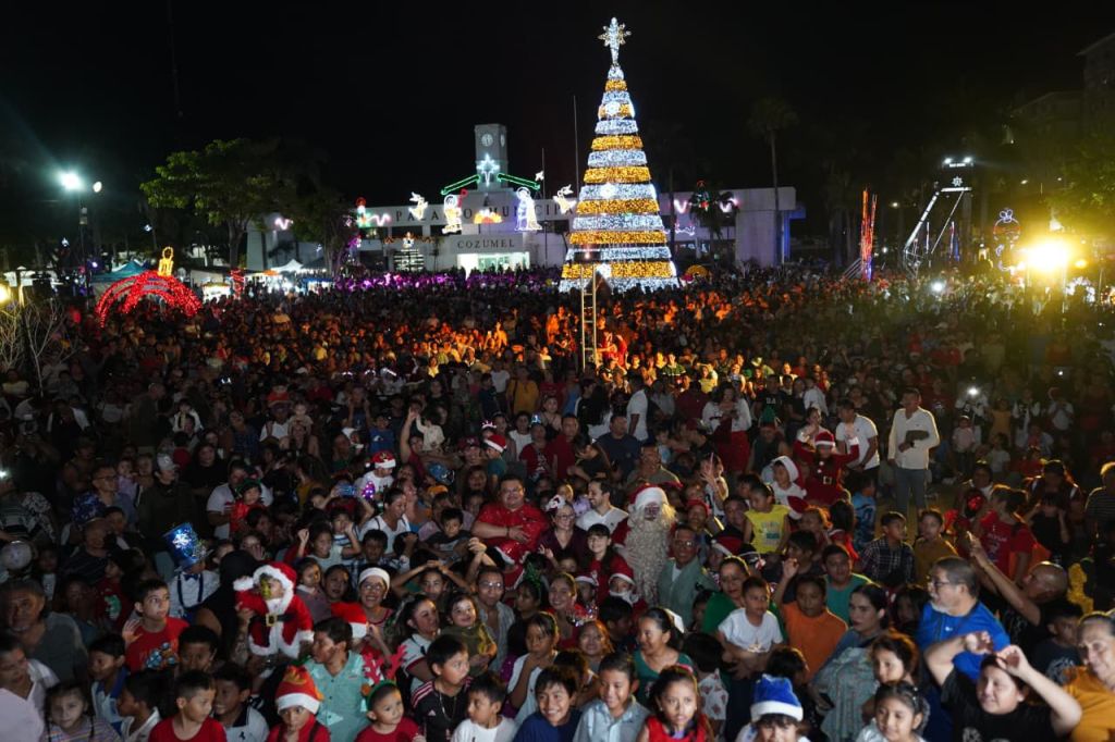Cozumel, a 6 de diciembre de 2025.- El segundo festival navideño “Mar de estrellas” dio inicio con el brillante encendido de luces del árbol y del parque Quintana Roo, donde un majestuoso escenario en tonos rojos, dorados y verdes, acompañado de enormes cajas de regalo y la villa de la Navidad, creó un ambiente mágico que invitó a las familias a capturar las mejores postales de recuerdo. Entre música, color y espíritu decembrino, Cozumel vivió una noche llena de tradición y alegría.