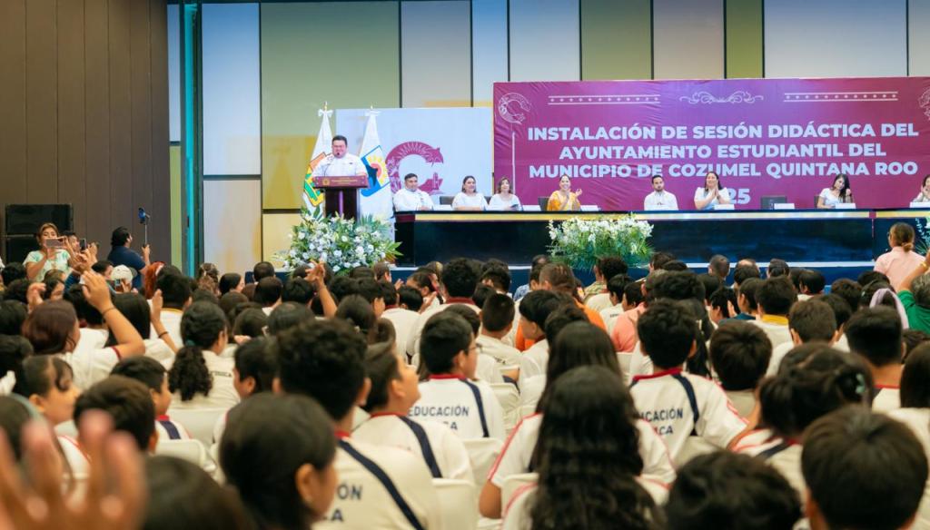 Cozumel, 10 de diciembre del 2025. – “Luchen por sus sueños, exploren con disciplina, responsabilidad y aporten ideas frescas para el bienestar de la comunidad… Como siempre lo he dicho, si ustedes tienen un buen presente, Cozumel tendrá un mejor futuro”, expresó el Presidente Municipal, José Luis Chacón Méndez al instalar la Sesión didáctica del Ayuntamiento Estudiantil 2025 en el Centro de Convenciones de la Isla.