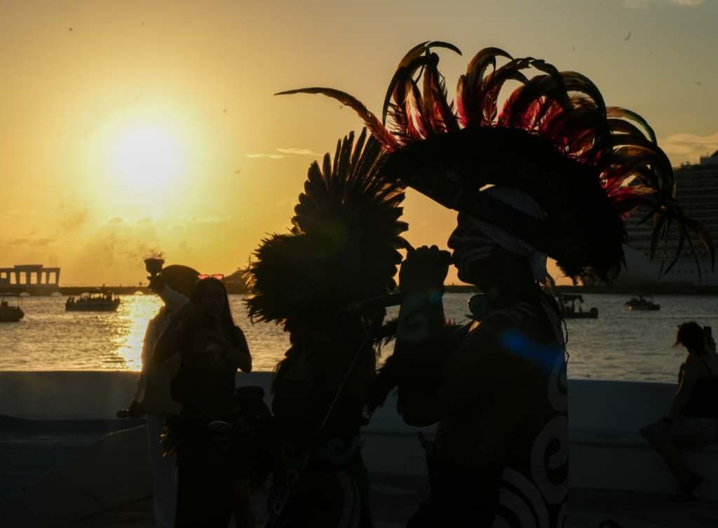 Danzantes prehispánicos y la participación de un X’men despidieron al sol, enmarcados por los tonos dorados y naranjas del astro rey mientras se ocultaba en el horizonte, creando un escenario perfecto para locales y visitantes, quienes captaron imágenes que hoy recorren redes sociales en distintas partes del mundo.