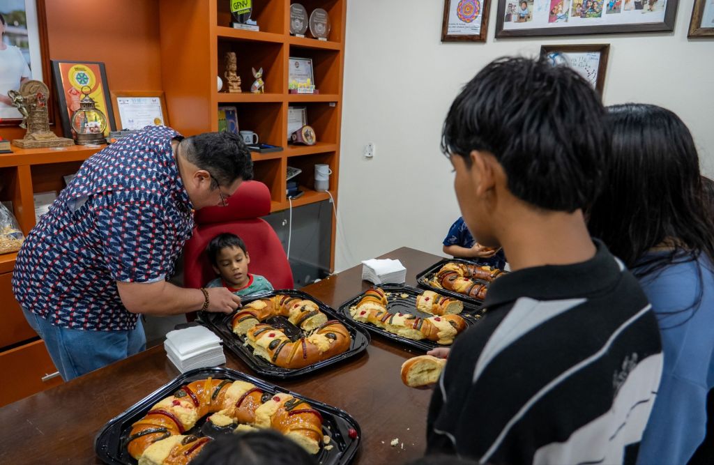 l presidente municipal, José Luis Chacón Méndez, compartió un momento de alegría con las familias que lograron llegar al festival a pesar de la lluvia, abriendo las puertas de su oficina para cortar la tradicional Rosca de Reyes” y tomarse la foto del recuerdo.