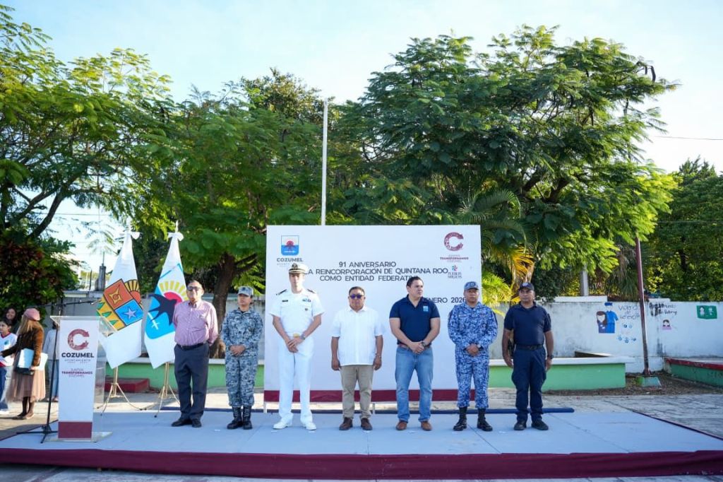 Cozumel, 16 de enero del 2026. – El Gobierno Municipal de Cozumel, a través de la Subdirección de Educación y la Biblioteca Pública, llevó a cabo la ceremonia cívica conmemorativa por el 91 aniversario de la reincorporación de Quintana Roo como Territorio Federal, teniendo como sede la escuela primaria Vicente Guerrero.