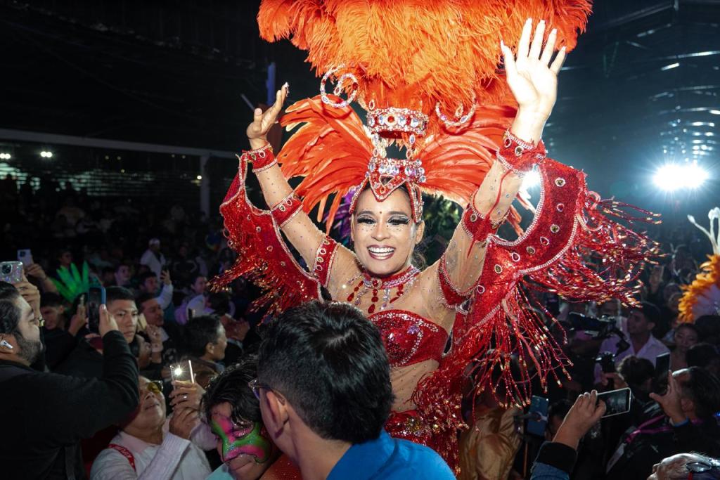 En la tercia de candidatas, Jojo Ramírez cerró con una presentación llena de sensualidad y carisma, acompañada por su comparsa en una fusión de bailes rítmicos, futuristas y tropicales que transformaron la pista en una auténtica fiesta de color, luz y brillo.