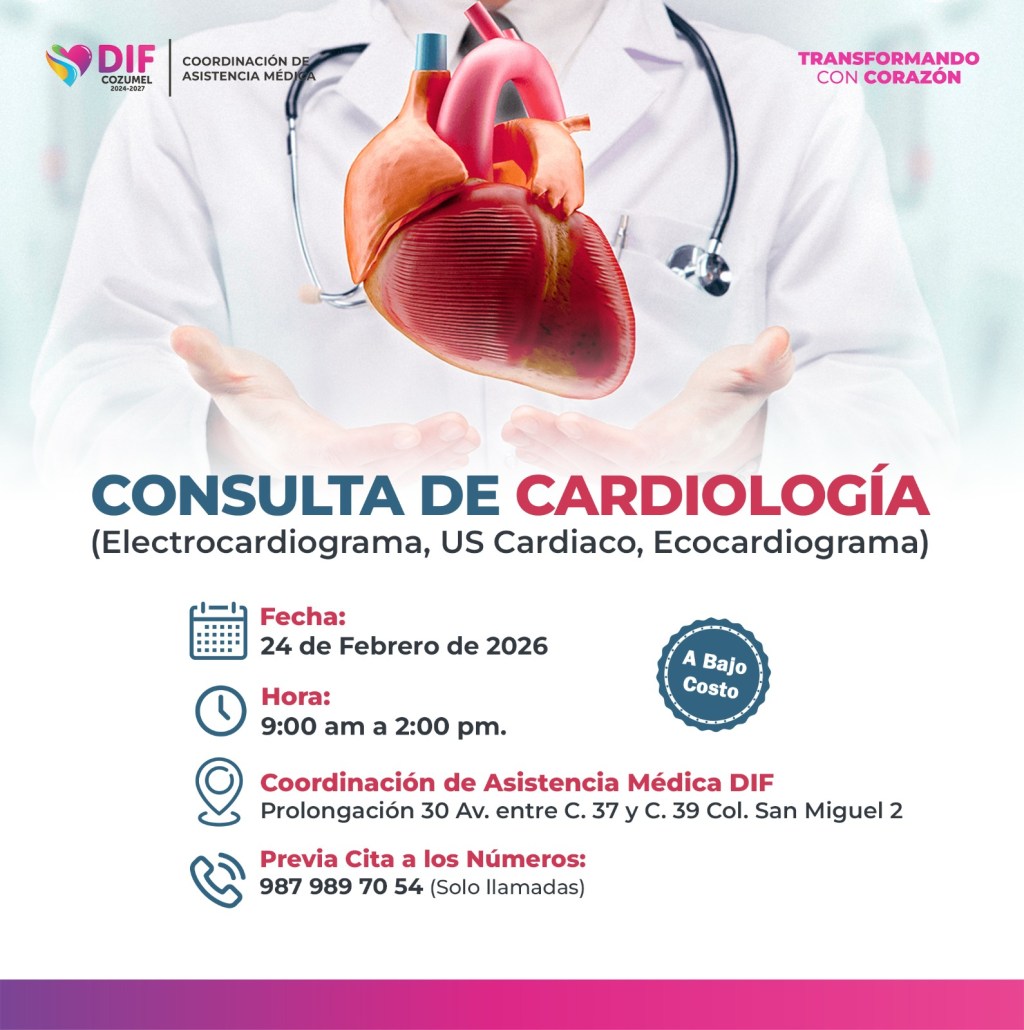 Las consultas serán este 24 de febrero de 2026 con consultas de Cardiología, donde se realizarán electrocardiogramas, ultrasonidos cardiacos y ecocardiogramas de 9 de la mañana a 2 de la tarde en la Coordinación de Asistencia Médica ubicada en prolongación 30 avenida entre calles 37 y 39 de la colonia San Miguel 2.