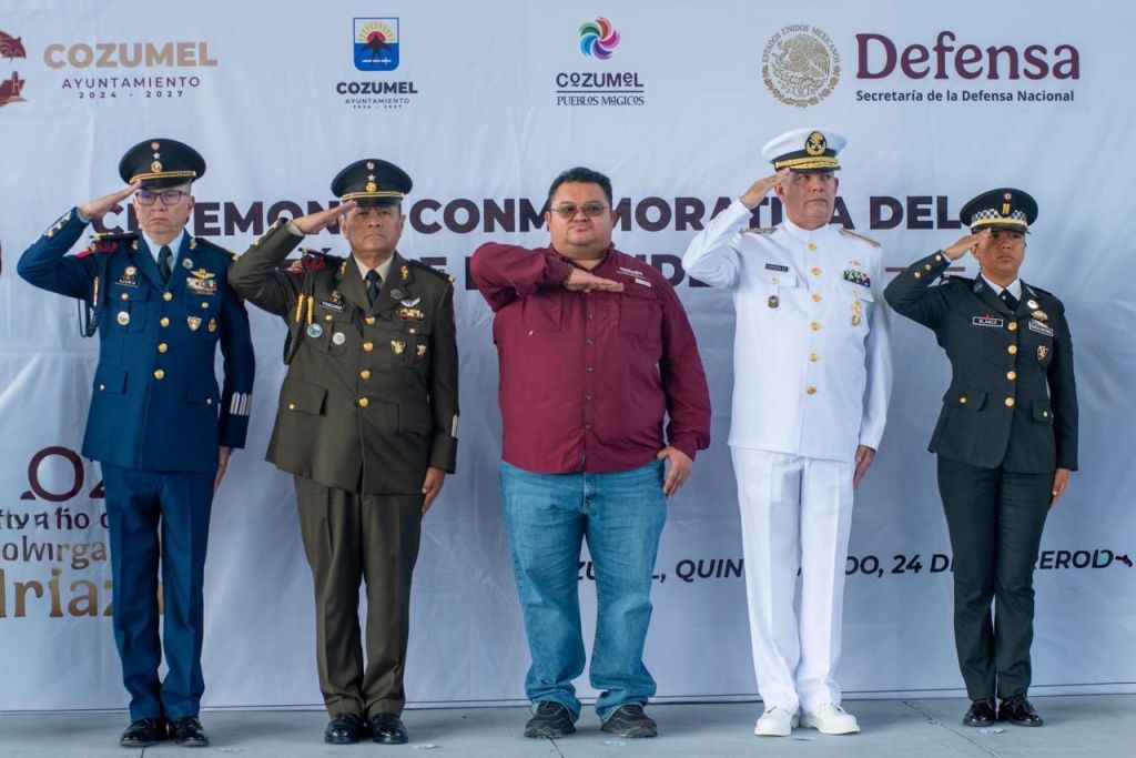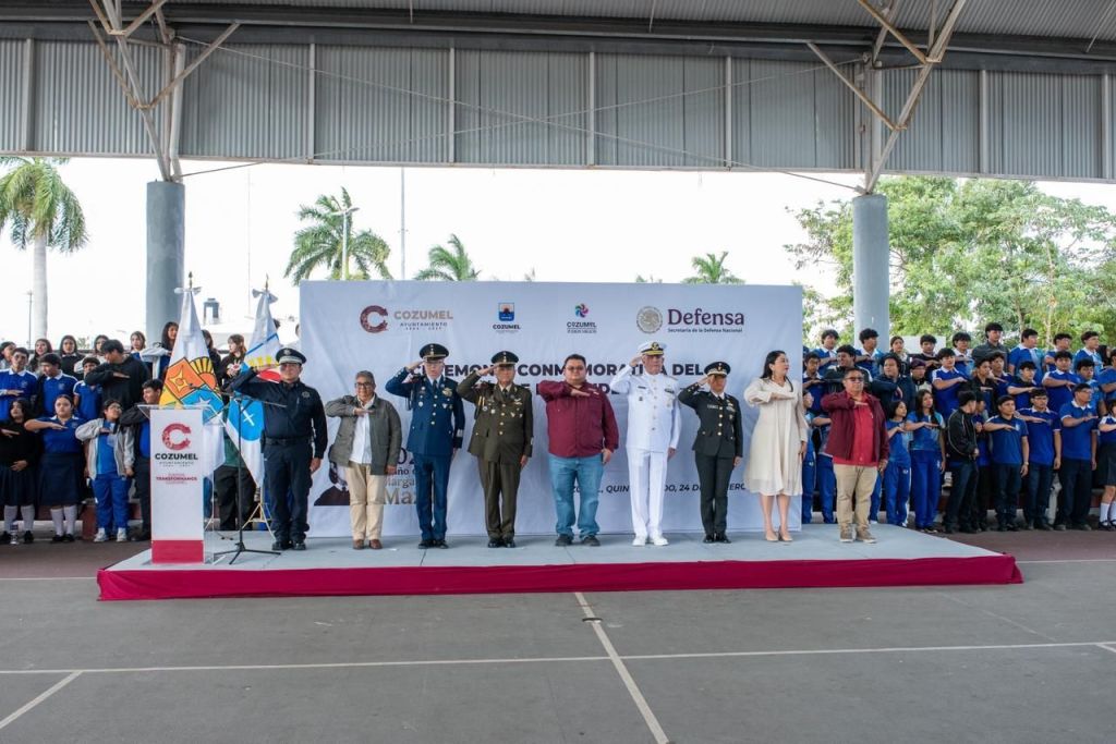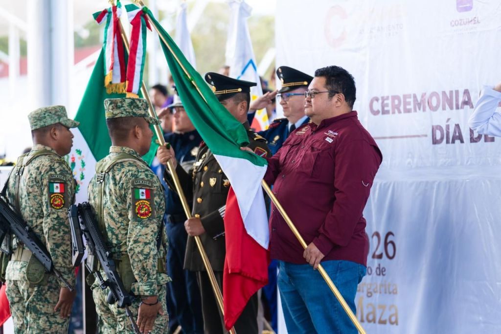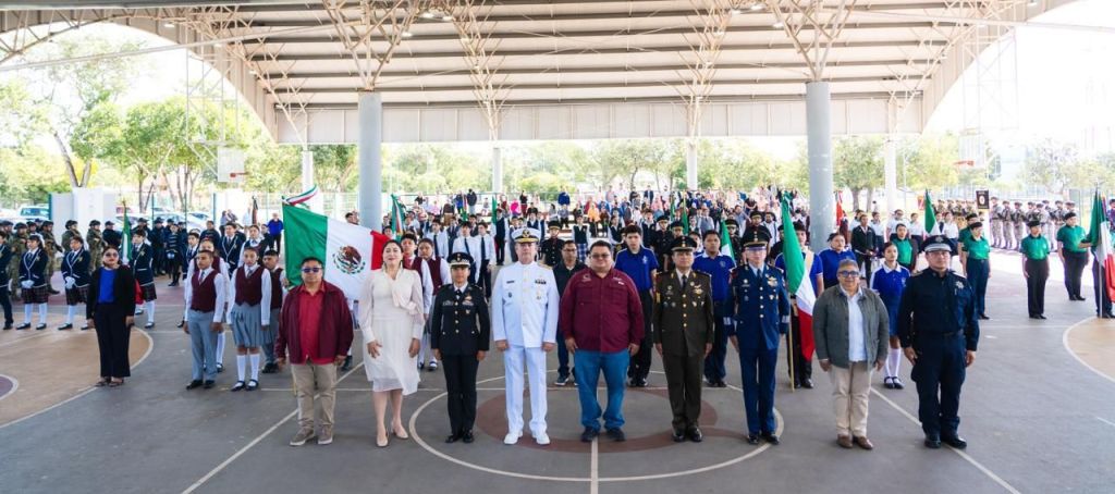 Cozumel, 24 de febrero de 2026. – El Gobierno Municipal en coordinación con la Guarnición Militar llevó a cabo la ceremonia conmemorativa del Día de la Bandera en el domo de la Unidad Deportiva Bicentenario, encabezada por el presidente municipal, José Luis Chacón Méndez, con la participación de autoridades civiles, educativas y militares, así como de estudiantes de distintos planteles del municipio.