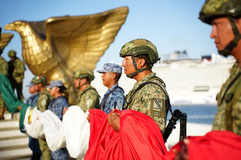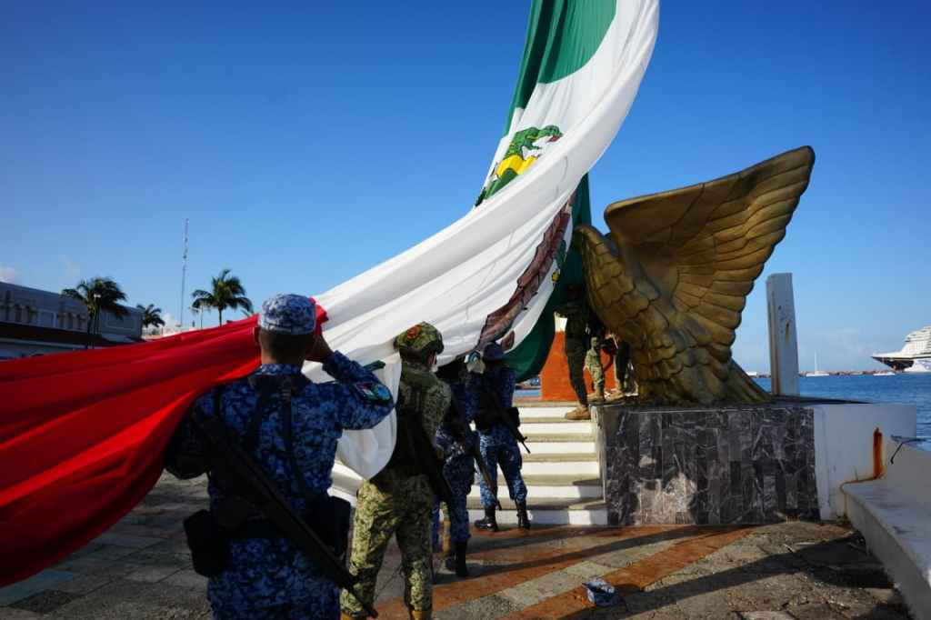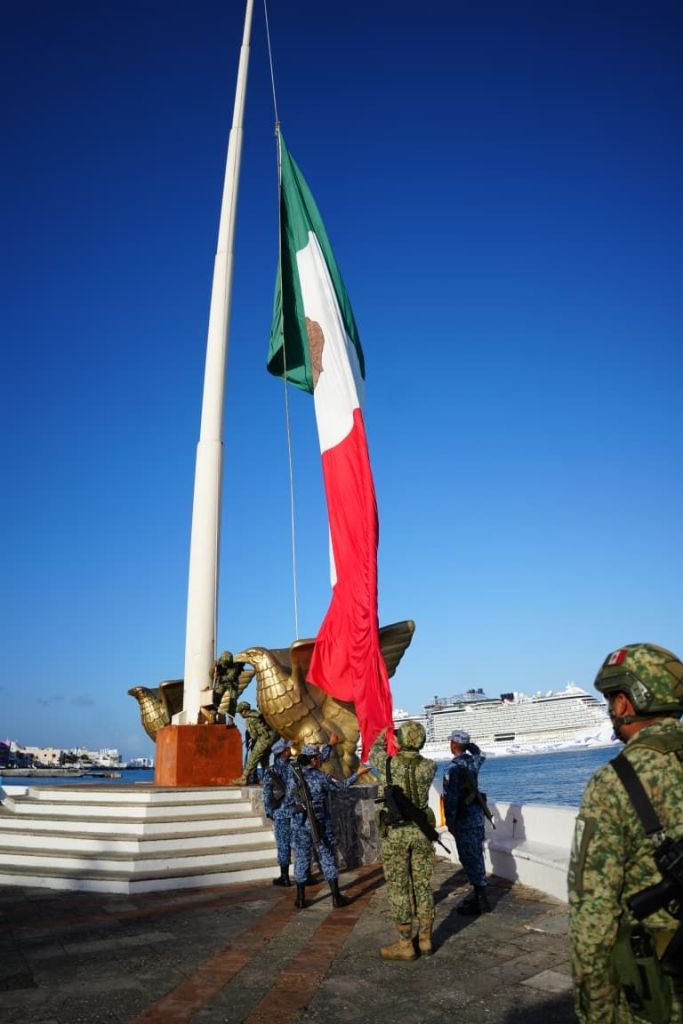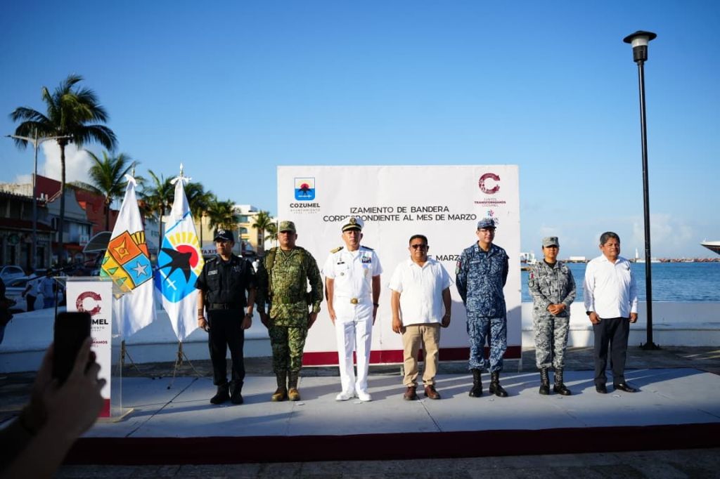 Cozumel, a 2 de marzo de 2026.- La mañana de este lunes, en la explanada de la Bandera, se llevó a cabo el izamiento de la Bandera Monumental correspondiente al mes de marzo, ceremonia cívica en la que participaron autoridades municipales, fuerzas destacamentadas, así como alumnas y alumnos de instituciones educativas, quienes rindieron los honores correspondientes al lábaro patrio.