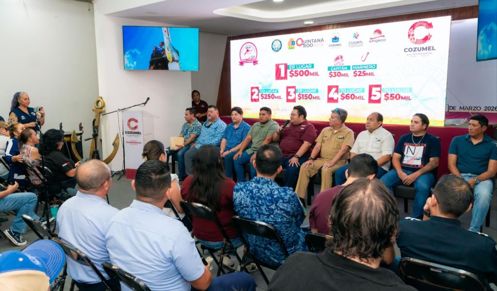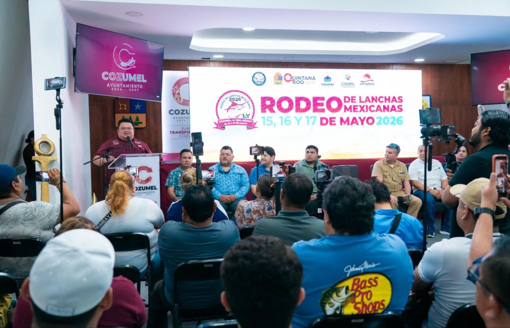 Cozumel, 26 de marzo de 2026. El presidente municipal, José Luis Chacón Méndez, encabezó la rueda de prensa para presentar la LV edición del Rodeo de Lanchas Mexicanas Cozumel 2026, que se llevará a cabo del 15 al 17 de mayo, con la expectativa de superar los récords de participación registrados en la etapa postpandemia.