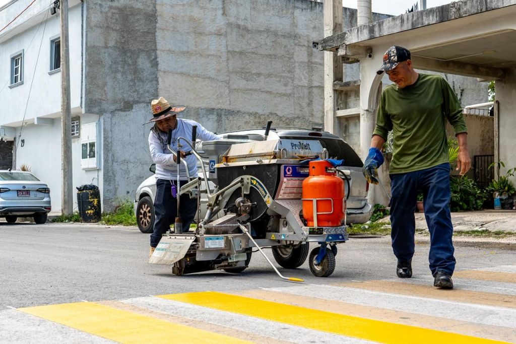 Cozumel, a 8 de abril de 2026.- El gobierno municipal que encabeza José Luis Chacón Méndez realizó trabajos de marcaje de cruces peatonales en escuelas públicas de la isla, utilizando pintura termoplástica con microesferas que permite mayor visibilidad y reflejancia con la luz de los vehículos, con el objetivo de fortalecer la seguridad vial y proteger a niñas, niños, padres de familia y personal educativo durante los horarios de entrada y salida.
